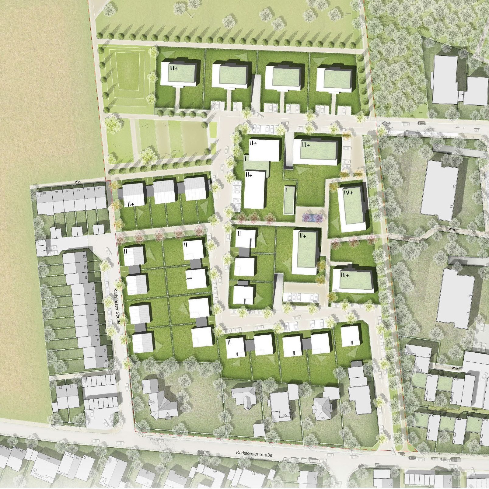 Städtebauliches Strukturkonzept und bauleitplanerische Umsetzung eines Wohnquartiers mit Einzelhandel im Auftrag von Wilma Wohnen West Projekte GmbH (Ratingen).