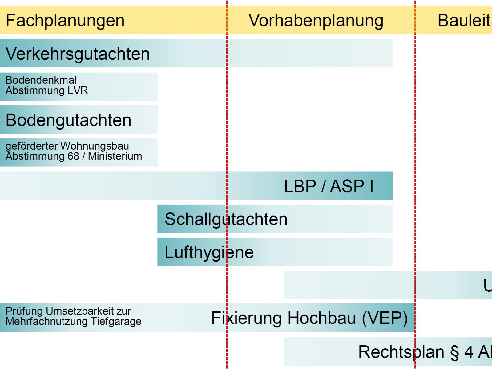 Wir sorgen für eine reibungslose Umsetzung Ihrer Projekte: Das Planungsmanagement inkludiert je nach Bedarf die Öffentlichkeitsbeteiligung, die fachgerechte Behördenabstimmung, die realistische Projekt-Ablaufplanung, sowie die Koordination der Beteiligten. Diese Prozesse werden von rheinruhr.stadtplaner fachlich fundiert moderiert und dokumentiert. Darüber hinaus begleiten wir städtebauliche Gutachterverfahren – von der Programmentwicklung über die Auslobung und Vorprüfung bis hin zur Jury-Information und Dokumentation.